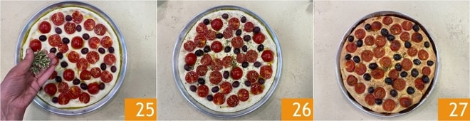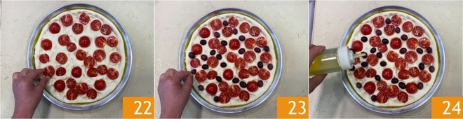 Arrume os tomatinhos por cima, pressionando levemente 22, depois faça o mesmo com as azeitonas 23. Salgue a superfície e tempere com bastante azeite 24.