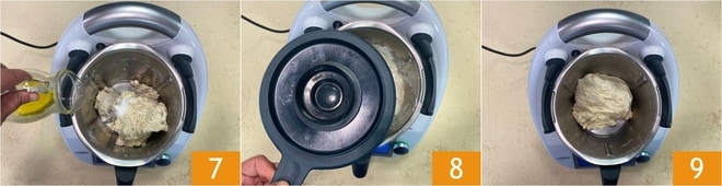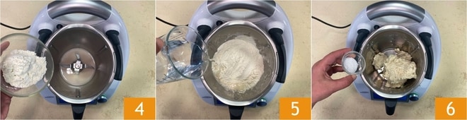Adicione 50 g de farinha de trigo 4 e misture por um minuto na velocidade 3. Deixe descansar dentro do copo por 10 minutos. Adicione o restante das farinhas e também os outros 200 g de água 5, e então sove com a função espiga por 2 minutos. Neste ponto, adicione os 10 g de sal 6.