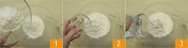 Para preparar a focaccia primavera, comece pela massa. Em uma tigela, misture as farinhas 1, o fermento esfarelado 2 e toda a água 3.