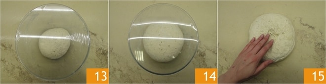 Coloque em uma tigela e cubra com filme plástico 14, deixe fermentar em temperatura ambiente por cerca de 2 horas ou até dobrar de volume 14. Transfira a massa para a bancada e achate-a levemente com as mãos 15.