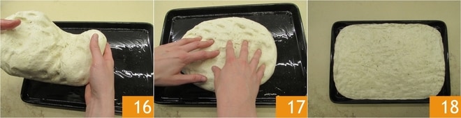 Transfira para uma assadeira previamente untada de 25x18 cm 16. Estenda a focaccia, alargando a massa com as pontas dos dedos 17 e puxando delicadamente até cobrir toda a superfície 18.