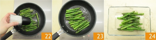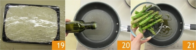 Cubra com filme plástico 19 e deixe fermentar por mais cerca de 30 minutos em temperatura ambiente. Enquanto isso, prepare os aspargos. Coloque em uma frigideira um fio de azeite 20 e adicione os aspargos congelados 21.