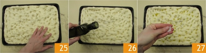 Agora, com as mãos untadas, faça os clássicos buracos na massa, pressionando delicadamente 25, depois polvilhe com azeite 26 e flocos de sal 27.