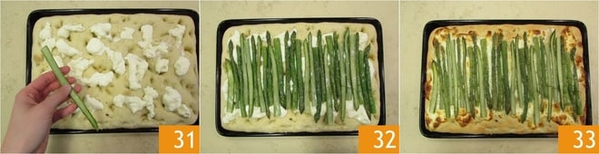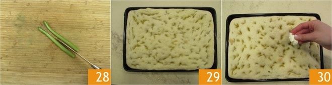 Neste ponto, asse em forno estático pré-aquecido a 190° por 20 minutos. Enquanto isso, corte os aspargos ao meio no sentido do comprimento 28. Após os primeiros 20 minutos, retire a focaccia do forno 29 e cubra com o queijo stracchino que você irá rasgar com as mãos ou com uma colher 30.