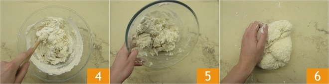 Comece a misturar com uma colher 4 e quando a água for absorvida, transfira a massa para a bancada 5 e sove energicamente até que fique homogênea 6.