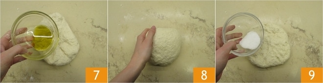 Neste ponto, adicione o óleo em três vezes 7, adicionando mais somente quando a primeira porção for absorvida pela massa. Uma vez absorvido todo o óleo 8, adicione o sal 9 e sove até que esteja bem incorporado.