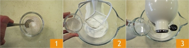 Para preparar a focaccia simples feita em casa, comece misturando em um potinho o fermento com o açúcar 1 e despeje-o, junto com a farinha, na tigela de uma batedeira planetária equipada com a pá 2. Ligue a batedeira e despeje aos poucos o leite e a água que você misturou 3.