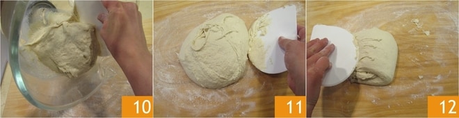 Transfira a mistura para uma superfície de trabalho levemente enfarinhada, sempre ajudando-se com a espátula 10, e com ela faça algumas dobras, ou seja, levante uma aba 11 e leve-a ao centro 12. Em seguida, levante a outra extremidade e traga-a também para o meio e repita mais uma vez.
