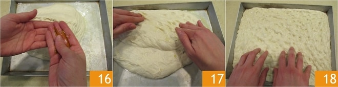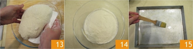 Coloque a mistura em uma tigela 13 e cubra com filme plástico. Coloque a tigela no forno desligado com a luz acesa e deixe fermentar por 2 horas ou até dobrar de tamanho 14. Unte uma assadeira (usamos uma assadeira retangular de 35x28 cm) pincelando cuidadosamente toda a superfície e ao longo das bordas 15,