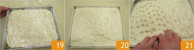 Uma vez terminado, cubra com filme plástico 19 e deixe fermentar por mais uma hora no forno desligado, mas com a luz acesa 20. Após o tempo, crie covinhas na massa com as pontas dos dedos untadas com azeite 21.