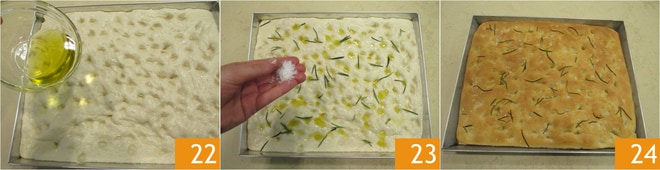 Polvilhe com azeite 22, algumas folhas de alecrim e flocos de sal 23. Sua focaccia está pronta para ser assada em forno estático a 180°C por cerca de 35-40 minutos, na parte inferior (verifique de tempos em tempos o cozimento sem abrir o forno). Uma vez assada 24, resta apenas tirá-la do forno e apreciá-la ao natural ou recheada!