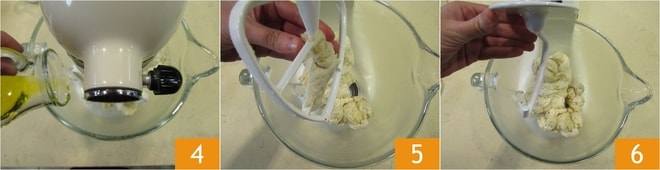 Depois adicione o azeite, também aos poucos 4. Continue a amassar até notar que a massa ganhou um pouco de consistência, então substitua a pá 5 pelo gancho 6.