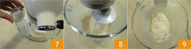 Adicione o sal 7 e continue a amassar por cerca de 15 minutos 8 até que a massa esteja bem uniforme: a massa é muito hidratada, então use uma espátula para soltá-la do gancho 9.