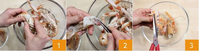 Para realizar o folhado clássico com camarões salteados ao balsâmico, você deve começar pela limpeza dos camarões: primeiro lave bem os camarões sob água corrente fria, retire a cabeça 1 e extraia o intestino com a ajuda de uma pinça de cozinha 2. Corte as partes laterais da carapaça com uma tesoura 3
