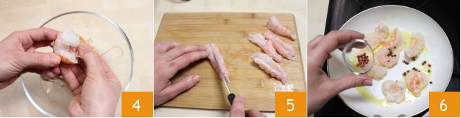 e retire o interior 4, dessa forma você conseguirá manter a carne inteira. Faça uma incisão nas costas do camarão 5. Coloque uma frigideira no fogo com um fio de óleo, adicione os camarões limpos, acrescente a pimenta rosa 6 e salteie por 5 minutos,