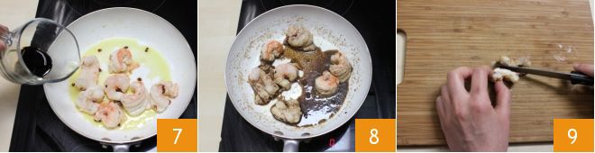 após esse tempo, adicione o vinagre balsâmico 7 e salgue. Cozinhe por mais 10 minutos em fogo alto para que o molho engrosse 8. Neste ponto, os camarões estão prontos, cortados ao meio 9