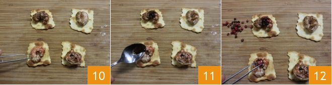 e comece a compor os petiscos: pegue um folhado, coloque meio camarão por cima 10, tempere ainda com algumas gotas de vinagre balsâmico 11 e com os grãos de pimenta rosa 12. Seu folhado clássico com camarões salteados ao balsâmico está pronto para ser servido!