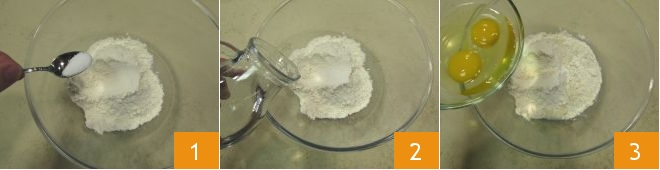 Para preparar os saccottini de maçã e chocolate, primeiro prepare a massa: peneire a farinha e o fermento em uma tigela, adicione o sal 1, a água 2, os ovos 3