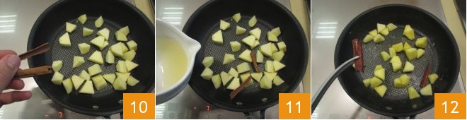 Agora coloque os cubos de maçã em uma panela, adicione as canelas em pau 10 e o suco de limão 11 e salteie em fogo alto por 5 minutos, em seguida, remova a canela 12.