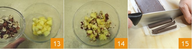 Transfira as maçãs para uma tigela, adicione as avelãs picadas 13, misture bem e deixe esfriar 14. Por último, corte a barra de chocolate em bastões 15.