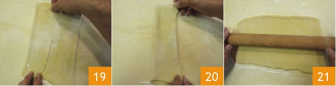faça o mesmo com o lado oposto 19 e pincele novamente o retângulo obtido com água, depois dobre ao meio no comprimento 20 de modo a obter um retângulo de cerca de 15x20 cm. Deixe a massa descansar por alguns minutos, depois abra novamente o retângulo com o rolo usando um pouco de farinha 21. Pré-aqueça o forno a 180° em modo estático.
