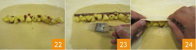 Agora você pode adicionar o recheio: coloque a mistura de maçãs e avelãs a alguns cm de distância da borda superior do retângulo obtido 22, adicione os bastões de chocolate e pincele a parte inferior com água 23; dobre a borda superior em sua direção para cobrir o recheio 24 e pressione levemente com os dedos para selar a massa.