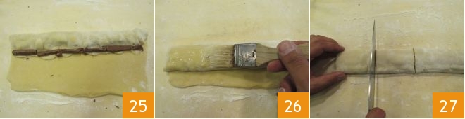 Adicione outra fileira de bastões de chocolate 25, pincele a parte inferior e continue dobrando a massa até alcançar a outra extremidade do retângulo. Por fim, pincele a superfície do rolo obtido com um pouco de água 26 e sele pressionando delicadamente. Mantendo a costura voltada para baixo, divida cada rolo em 4 partes 27