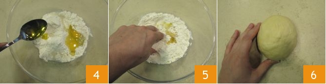 e o óleo 4. Amasse com os dedos para misturar todos os ingredientes 5, depois transfira a mistura para a bancada e continue a trabalhar até formar uma bola lisa e homogênea 6. Envolva a massa em filme plástico e deixe descansar em um lugar fresco por 30 minutos.