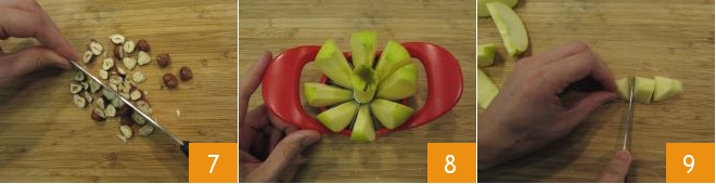 Enquanto isso, cuide do recheio: pique grosseiramente as avelãs 7, depois lave a maçã e divida-a em fatias, removendo o caroço 8. Por fim, descasque as fatias de maçã e corte-as em cubos 9.