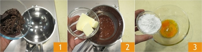 Para preparar o fondant au chocolat, primeiro pique grosseiramente o chocolate com uma faca e depois coloque-o em uma tigela para banho-maria, ou seja, coloque a tigela sobre uma panela com água no fogo 1. Mexa constantemente com uma espátula para derreter completamente, depois adicione a manteiga 2. Continue mexendo para misturar o composto. Uma vez pronto, apague o fogo e reserve. Em uma tigela, coloque os ovos e a gema, depois adicione o açúcar de confeiteiro 3 e as sementes da fava de baunilha.