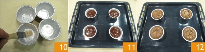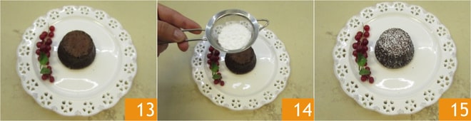Desenforme as tortinhas ainda quentes em um prato, tomando cuidado para não se queimar 13. Complete polvilhando o fondant au chocolat com o açúcar de confeiteiro 14 e sirva imediatamente 15!
