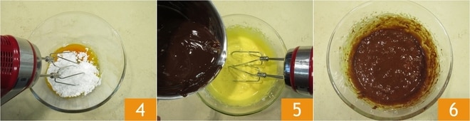 Trabalhe a mistura com a batedeira elétrica 4 até ficar clara e espumosa. Neste ponto, despeje o chocolate derretido 5 e continue misturando com a batedeira para integrar completamente a mistura 6.