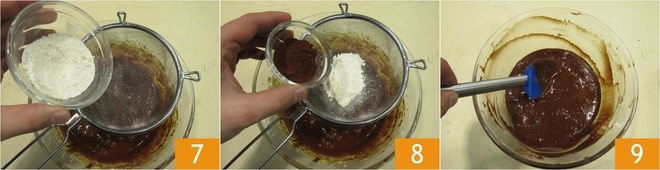 Agora adicione os ingredientes secos à mistura de ovos: peneire na tigela a farinha 7 e o cacau em pó 8, depois misture com uma espátula para incorporar os ingredientes 9.