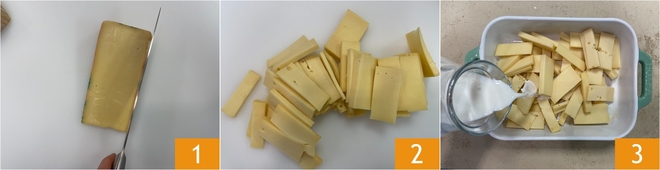 Para preparar a fonduta à Valdostana, primeiro retire a crosta externa da fontina 1, em seguida corte-a em fatias bem finas 2. Transfira o queijo para uma travessa e despeje o leite por cima 3.