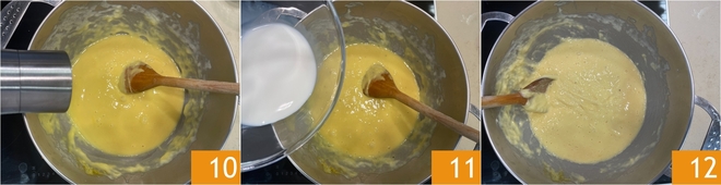 Tempere com pimenta 10 e mexa novamente. Em seguida, adicione cerca de 100 g do leite reservado 11; ajuste a quantidade conforme a consistência da fonduta, que não deve ficar nem muito líquida nem muito compacta. No total, o cozimento levará cerca de 30 minutos 12.