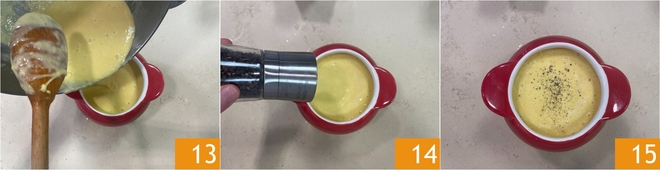 Quando pronta, transfira a fonduta para a típica panela de fondue e bourguignonne 13, com um fogareiro na base que manterá a fonduta aquecida e preservará sua consistência fluida. Decore com pimenta a gosto 14 e sirva imediatamente a sua fonduta à Valdostana 15!