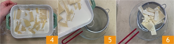 Cubra com filme plástico para alimentos 4 e deixe descansar na geladeira por uma noite. Decorrido o tempo de descanso, escorra o queijo do leite usando uma peneira 5 e reserve o leite 6.