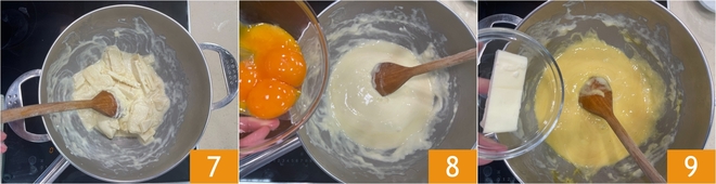 Em uma tigela (bastardella), apoiada sobre uma panela para cozimento em banho-maria, coloque o queijo escorrido. Derreta o queijo em fogo médio, mexendo com uma colher de madeira 7. No início você verá uma massa, depois aos poucos ela derreterá e ficará mais fluida. Neste ponto, junte as gemas uma a uma 8, mexendo continuamente. Incorpore também a manteiga fria 9 e continue mexendo.