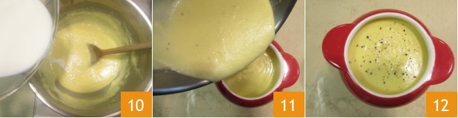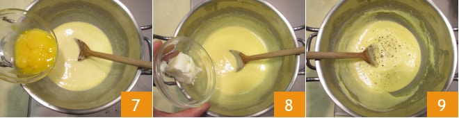 No início você verá uma massa, mas aos poucos ela se derreterá e se tornará mais fluida. Neste ponto, adicione as gemas uma a uma 7, e mexa continuamente. Incorpore também a manteiga fria 8 e continue mexendo. Adicione pimenta a gosto 9 à fonduta alla Valdostana e mexa novamente.