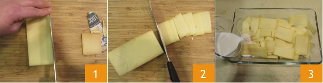 Para preparar a fonduta alla Valdostana, primeiro retire a crosta externa da fontina 1, depois fatie-a finamente 2. Transfira o queijo para uma assadeira retangular e despeje o leite por cima 3.