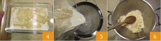 Cubra com filme plástico 4 e deixe na geladeira durante a noite. Após o tempo de descanso na geladeira, escorra o queijo do leite com uma peneira 5 e reserve o leite. Em uma tigela, colocada em uma panela para cozimento em banho-maria, coloque o queijo escorrido. Derreta o queijo em fogo médio mexendo com uma colher de pau 6.