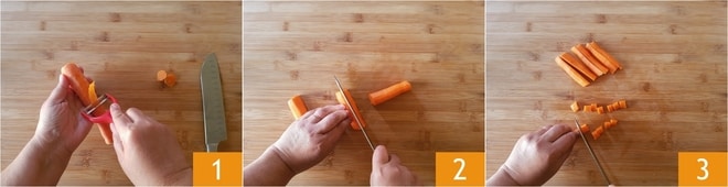 Para preparar o frango à caçadora em branco, a primeira coisa a fazer é descascar a cenoura 1, cortá-la e fatiá-la 2, depois cortá-la em cubos de 1 cm 3.