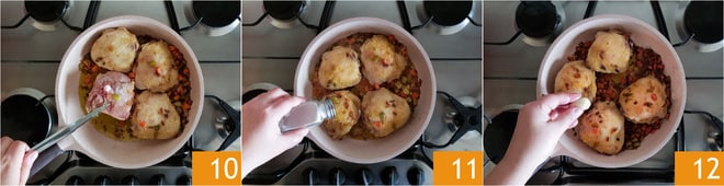 Deixe dourar e quando estiverem bem dourados, vire-os 10. Sal e pimenta a gosto 11, depois adicione o dente de alho 12