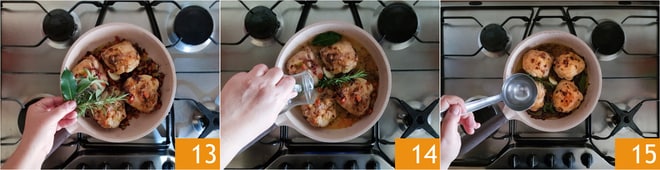 e as ervas aromáticas frescas 13. Regue com o vinho 14 e deixe evaporar por alguns segundos. Adicione uma concha de água quente 15,