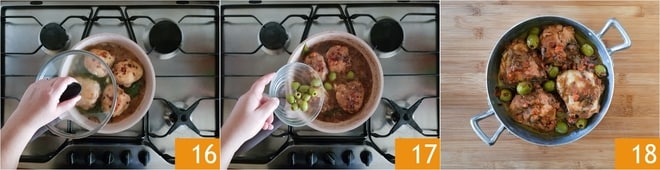 cubra com uma tampa e deixe cozinhar por cerca de 20 minutos, adicionando, se necessário, um pouco de água quente. Após o tempo, retire o alho e as ervas aromáticas, em seguida, adicione as azeitonas verdes sem caroço 17 e deixe no fogo por mais cinco minutos. Ao final do cozimento, retire do fogo e deixe o frango à caçadora em branco descansar por alguns minutos antes de servir 18.