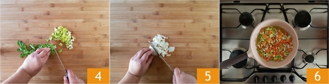 Lave o talo de aipo e corte em cubos do mesmo tamanho das cenouras 4. Descasque a cebola, depois fatie e pique grosseiramente 5. Despeje o óleo em uma panela grande, deixe aquecer e adicione os legumes picados 6.