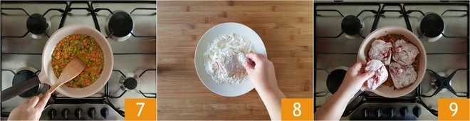 Deixe dourar por alguns minutos em fogo médio, mexendo sempre 7. Enfarinhe levemente as sobrecoxas de frango, sacudindo para retirar o excesso de farinha 8 e quando os legumes estiverem bem dourados, adicione o frango na panela, posicionando com a pele voltada para baixo 9.