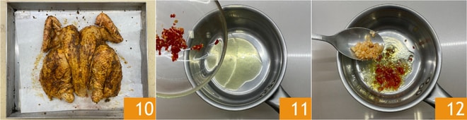 Após o tempo de descanso, asse o frango em forno estático pré-aquecido a 200° por 20 minutos 10. Enquanto isso, prepare o molho agridoce: em uma panela, refogue rapidamente o óleo com a pimenta 11 e o alho picado 12.