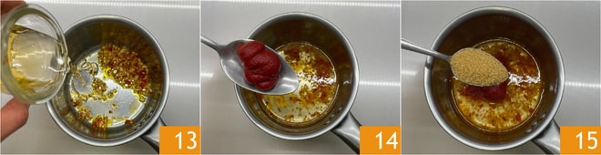 Adicione o vinagre 13, o extrato de tomate 14 e o açúcar mascavo 15.