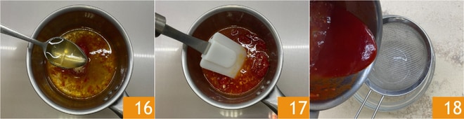 Por fim, adicione o mel 16 e cozinhe em fogo médio por 6-7 minutos 17; a consistência deve ser semelhante a um xarope. Coe o molho obtido através de uma peneira 18.